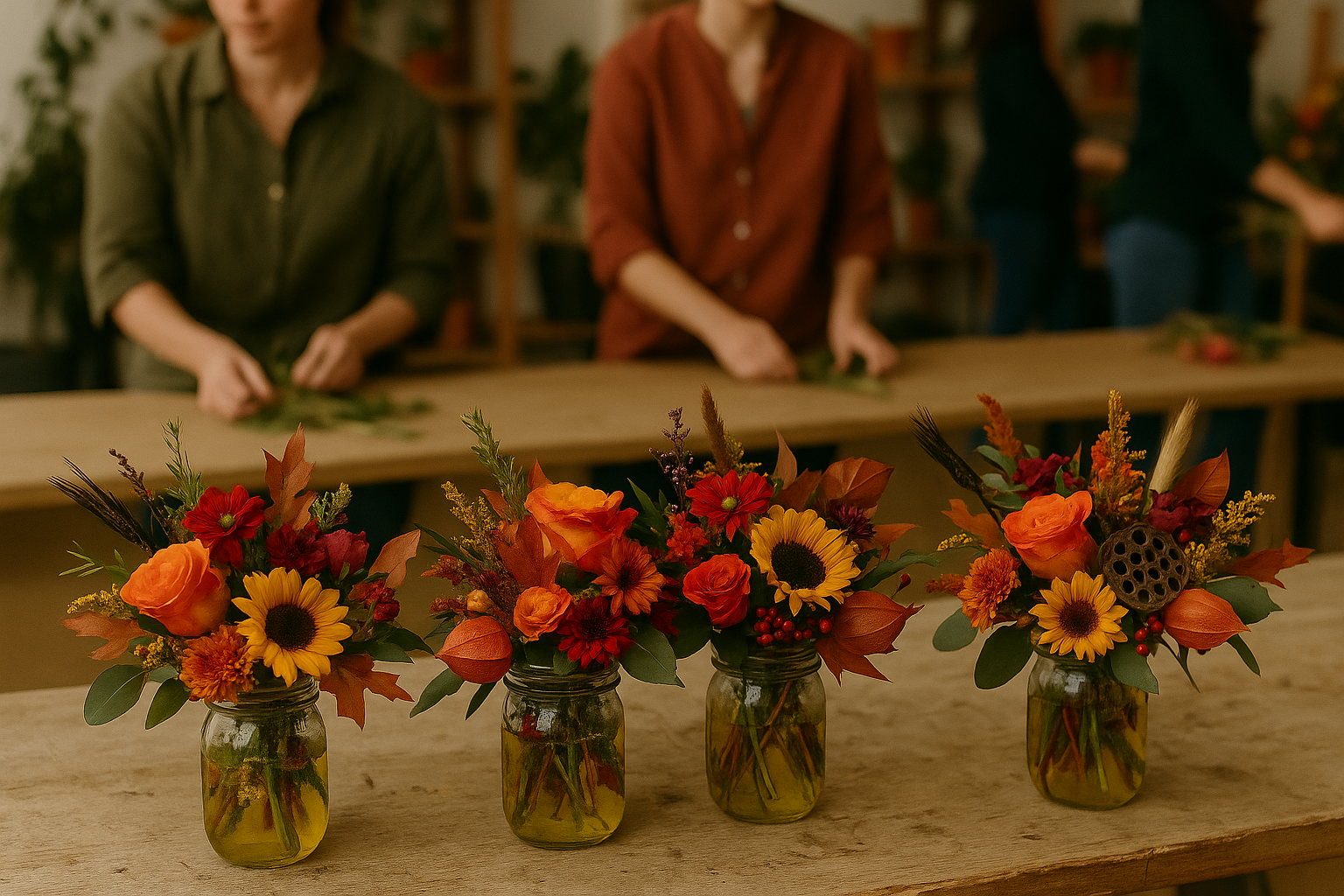 🍂 Guided Floral Design: Owner Lucy will walk you through arranging fall flowers in a mason jar, teaching tips on layering, shape, and how to highlight the rich colors of autumn.
