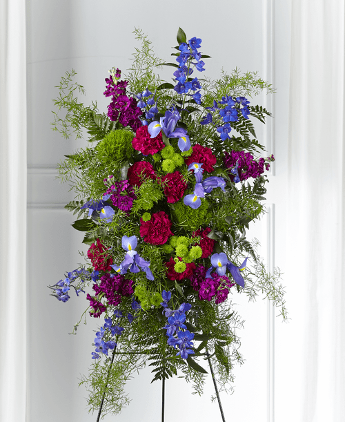 Bold and expressive, this standing spray offers a striking tribute in rich jewel tones. With its vibrant palette and natural texture, it celebrates a unique and beautiful life—honoring their spirit with color, depth, and heartfelt remembrance.