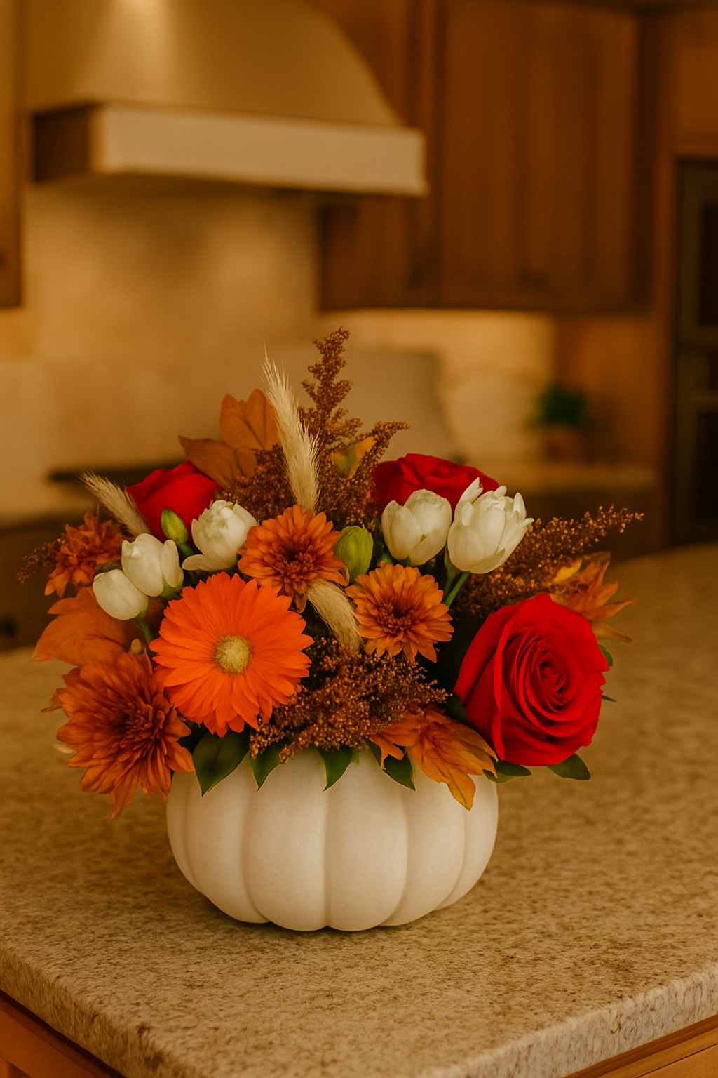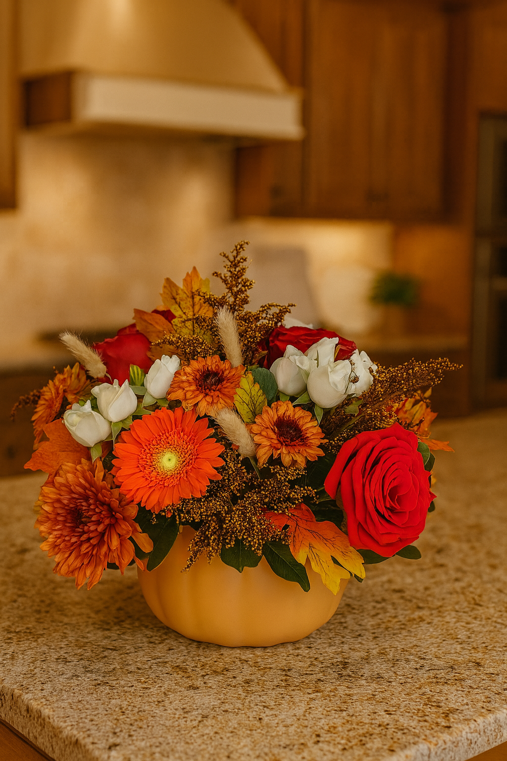 A festive fall arrangement designed in a pumpkin-inspired vase, filled with warm seasonal blooms and autumn foliage. Its vibrant mix of colors and textures makes it a cheerful way to celebrate the season, whether as a gift or a decorative accent at home.