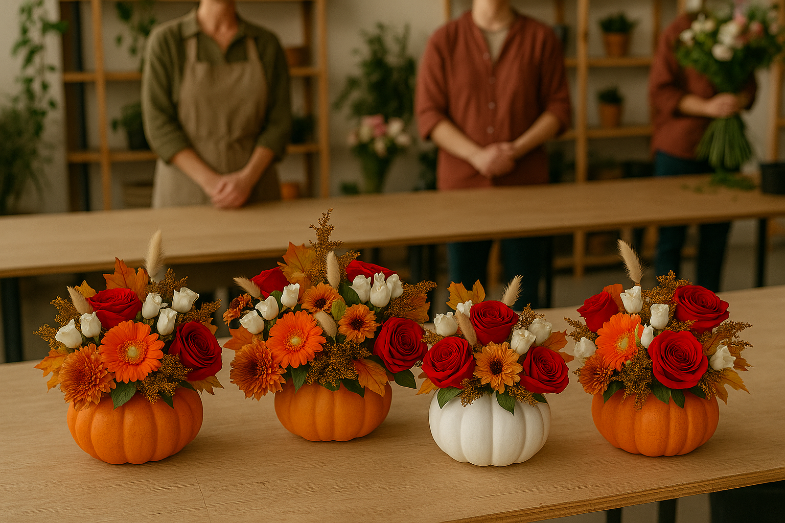 🎃 Guided Floral Design: Owner Lucy will guide you step by step through creating a lush fall arrangement, teaching balance, layering, and how to make your blooms stand out against your pumpkin base.