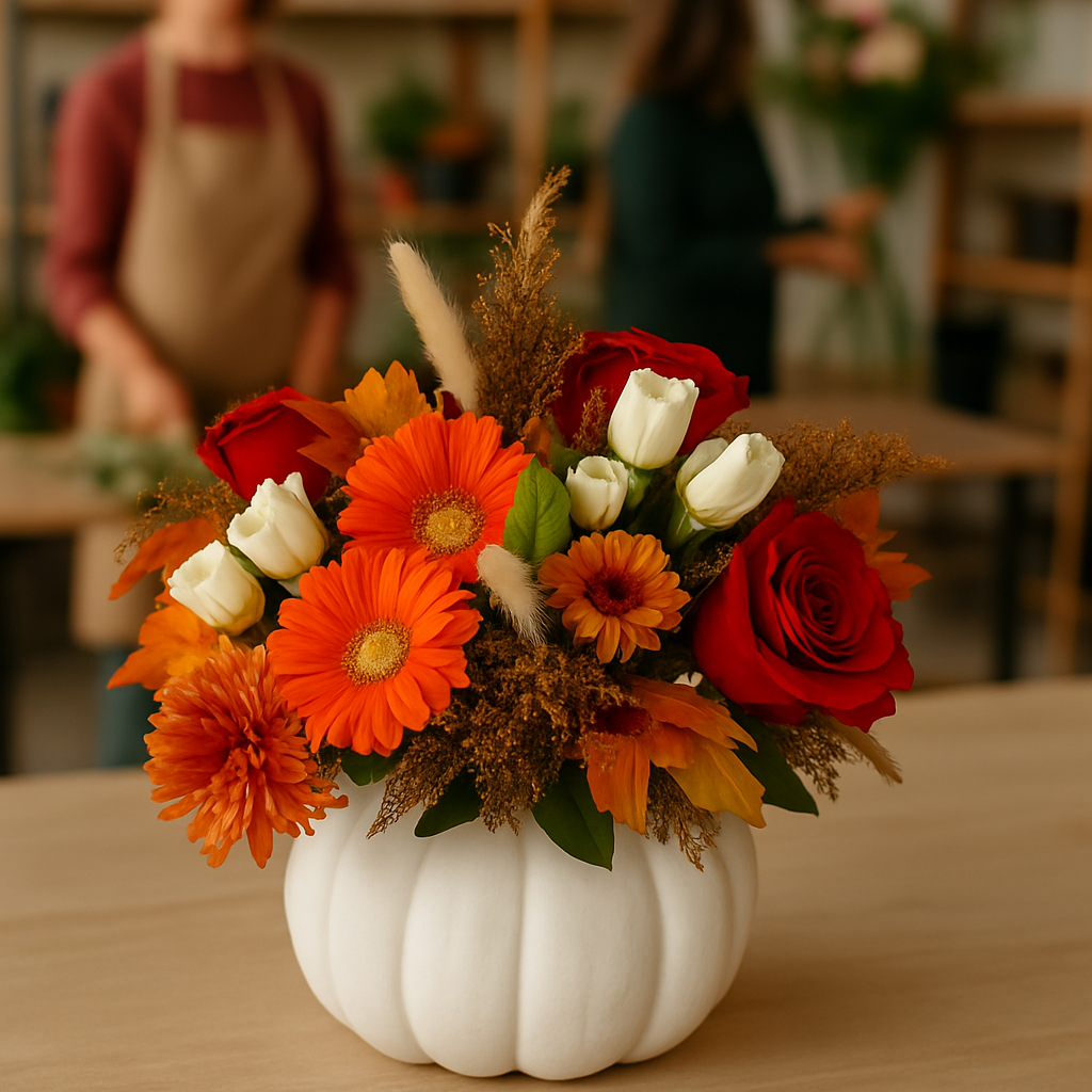 ✂️ All Materials Included: Fresh seasonal flowers, pumpkin vessel (orange or white), and all tools are provided.