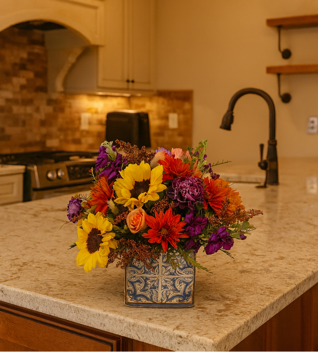 A cheerful burst of autumn color designed in a patterned ceramic cube vase. Bold seasonal tones mix with rich texture, creating a lively arrangement that feels both cozy and vibrant. Perfect as a centerpiece, a gift, or simply to brighten a room with the warmth of fall.