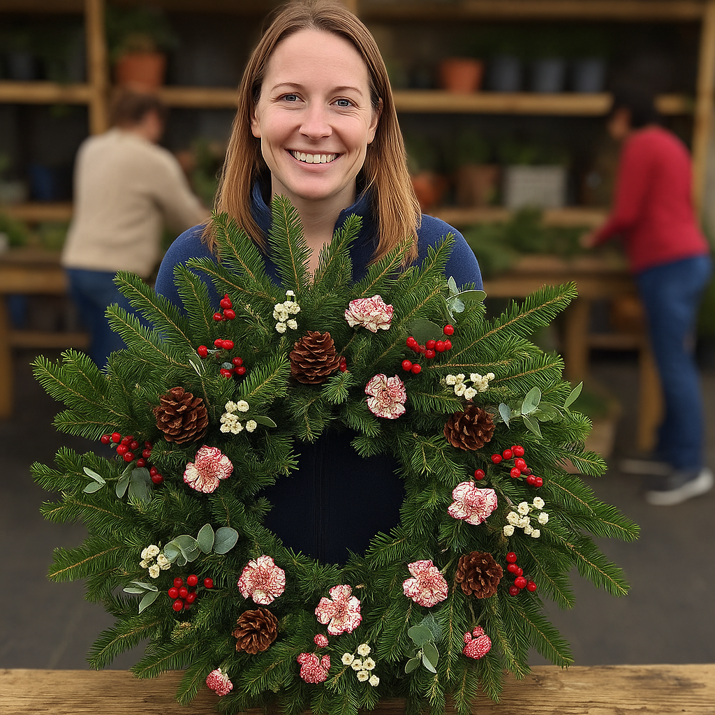 🌿 Guided Wreath Design: Owner Lucy will teach you how to build a full, balanced wreath with layers of fresh greens and natural textures, plus tips for making it sturdy and long-lasting.
